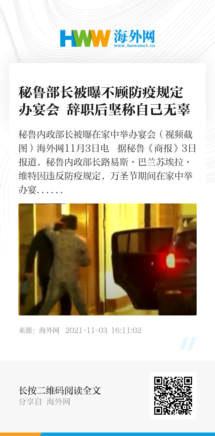 海外网11月3日电 据秘鲁《商报》3日报道,秘鲁内政部长路易斯·巴兰苏埃拉·维特因违反防疫规定,万圣节期间在家中举办宴会,受到媒体曝光批评后,于3日向总统卡斯蒂略递交辞呈。