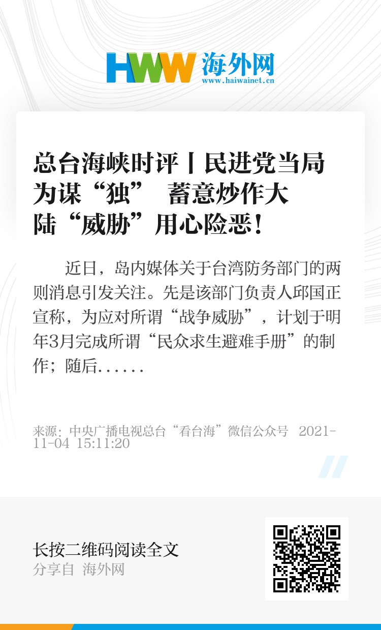 近日,岛内媒体关于台湾防务部门的两则消息引发关注。先是该部门负责人邱国正宣称,为应对所谓“战争威胁”,计划于明年3月完成所谓“民众求生避难手册”的制作;随后又爆出该部门明年将花费41亿新台币,启动3个方案,意图在战时“快速、有效治疗伤病患”。在台海局势日益复杂严峻的敏感时刻,民进党当局接连抛出备战信息,打着“保卫台湾”的旗号,制造岛内恐慌氛围,实则是为谋“独”蓄意炒作大陆“威胁”,用心险恶!