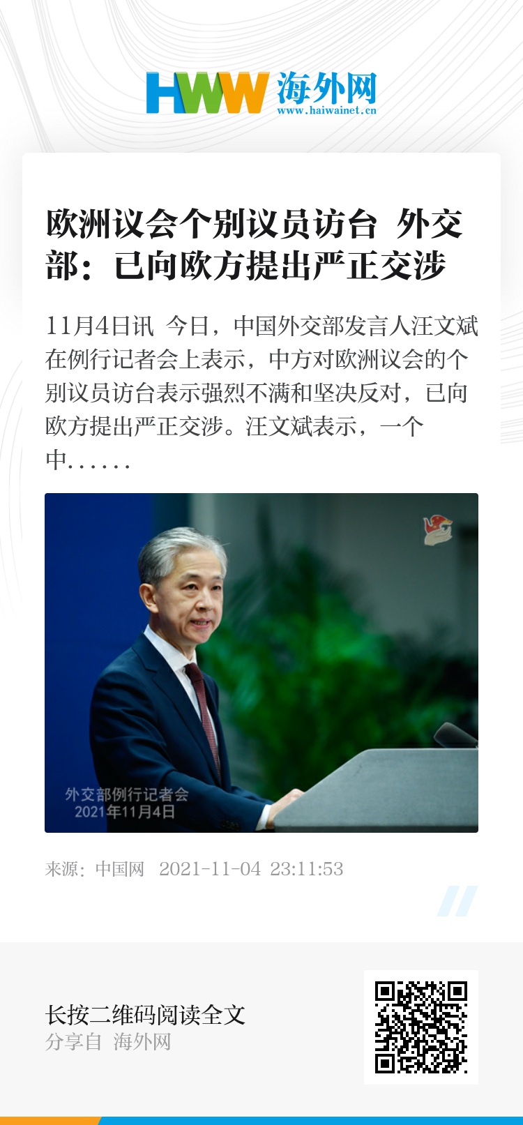 中国网11月4日讯 今日,中国外交部发言人汪文斌在例行记者会上表示,中方对欧洲议会的个别议员访台表示强烈不满和坚决反对,已向欧方提出严正交涉。