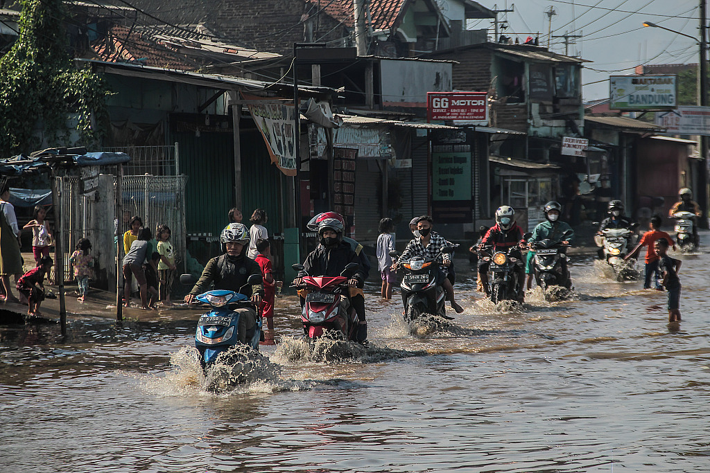 当地时间2021年11月3日,印尼万隆市,暴雨过后当地爆发洪灾,民众淌水撤离。图源:视觉中国