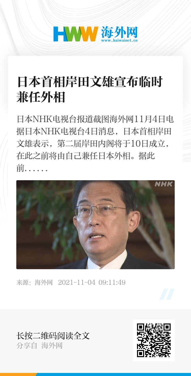 海外网11月4日电 据日本NHK电视台4日消息,日本首相岸田文雄表示,第二届岸田内阁将于10日成立,在此之前将由自己兼任日本外相。