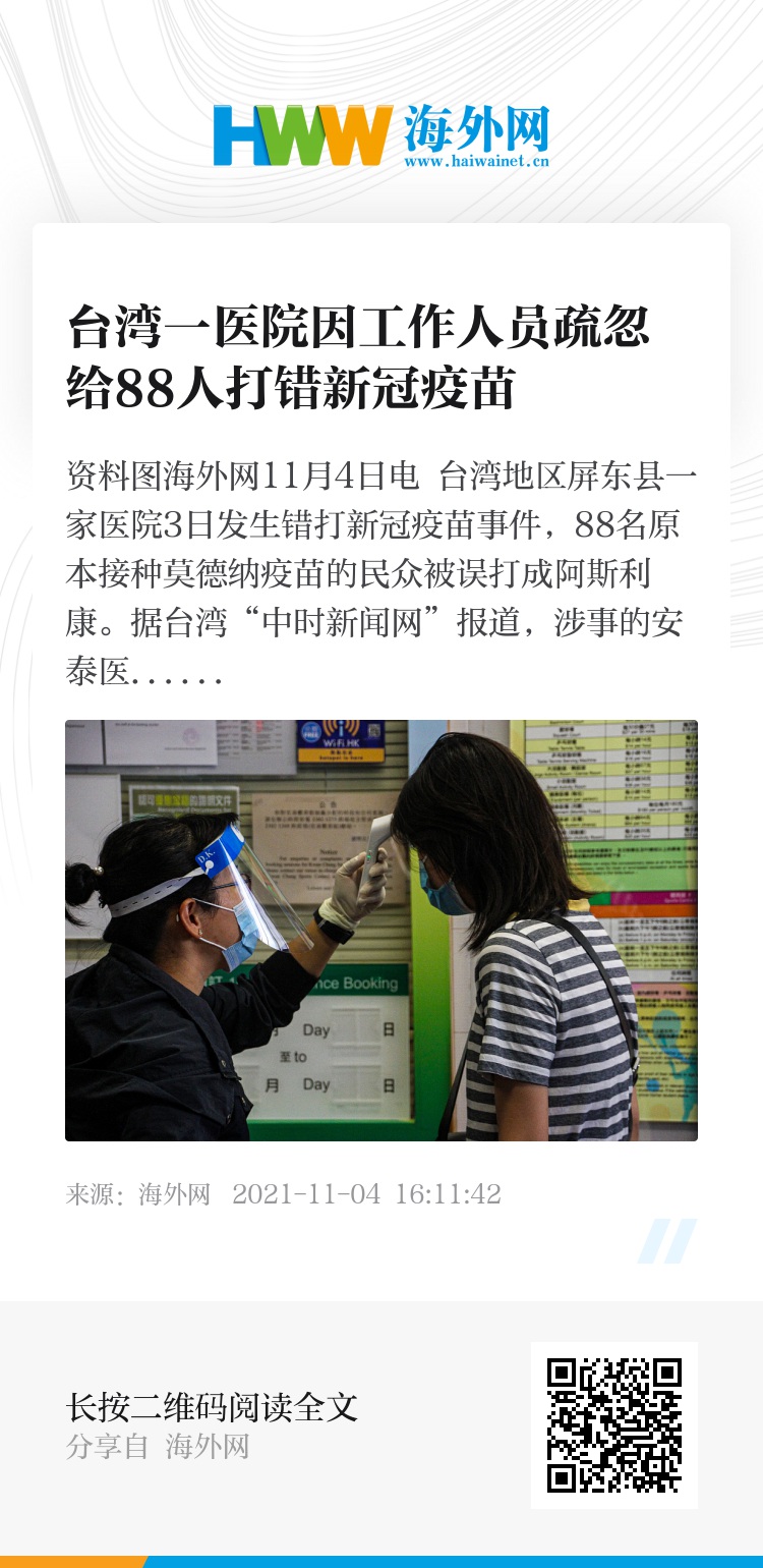 海外网11月4日电 台湾地区屏东县一家医院3日发生错打新冠疫苗事件,88名原本接种莫德纳疫苗的民众被误打成阿斯利康。