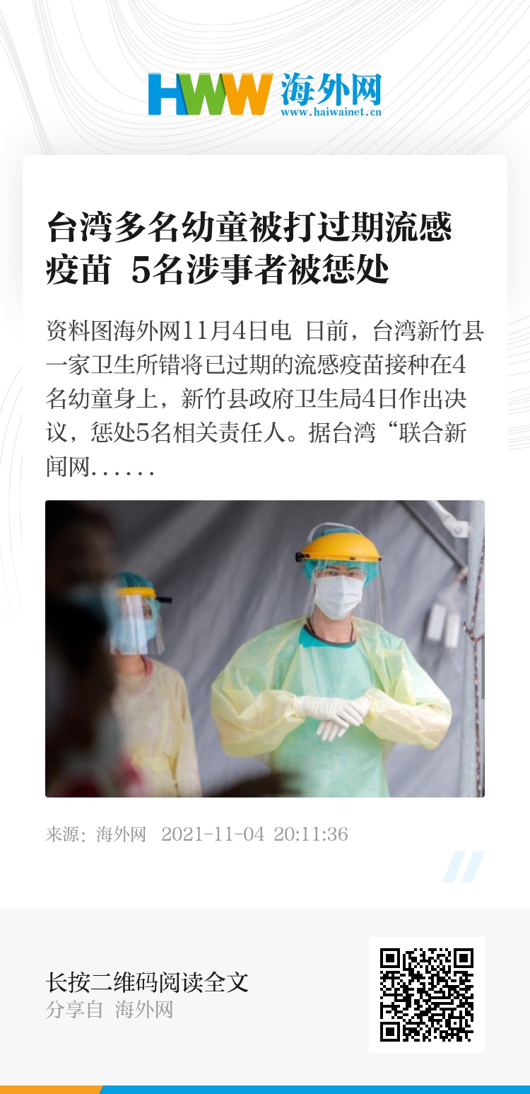海外网11月4日电 日前,台湾新竹县一家卫生所错将已过期的流感疫苗接种在4名幼童身上,新竹县政府卫生局4日作出决议,惩处5名相关责任人。