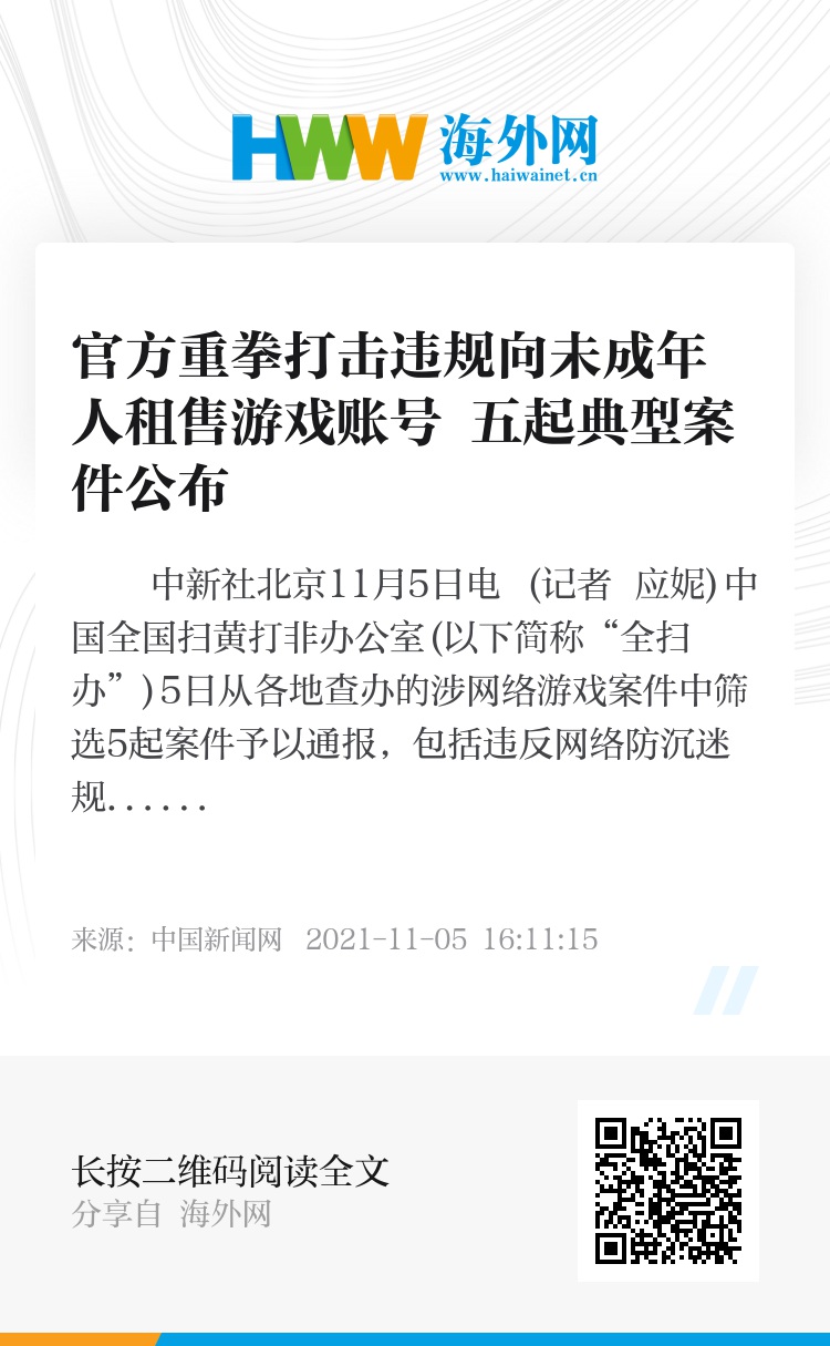 中新社北京11月5日电 (记者 应妮)中国全国扫黄打非办公室(以下简称“全扫办”)5日从各地查办的涉网络游戏案件中筛选5起案件予以通报,包括违反网络防沉迷规定向未成年人租售游戏账号、未经批准擅自出版或提供服务、含有妨害未成年人身心健康的违禁内容等类型。