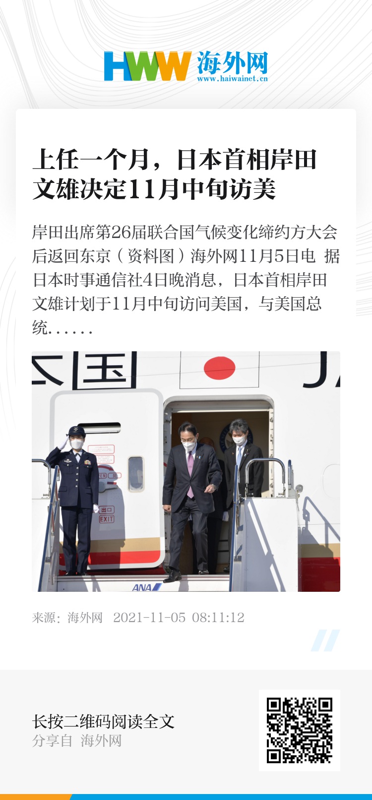 海外网11月5日电 据日本时事通信社4日晚消息,日本首相岸田文雄计划于11月中旬访问美国,与美国总统拜登举行会谈。岸田10月上旬刚当选日本首相,上任1个月时间内决定访美。