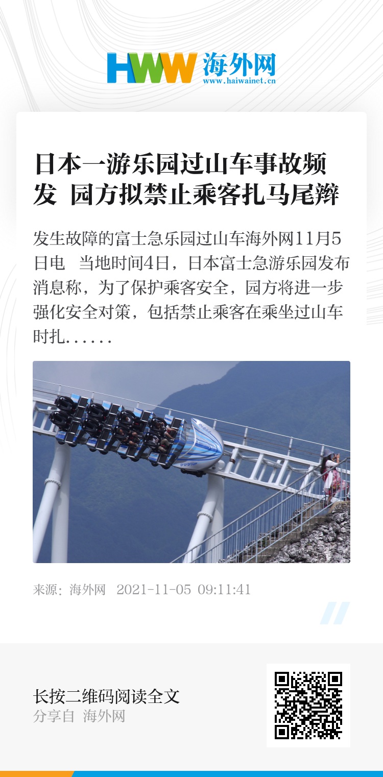 海外网11月5日电 当地时间4日,日本富士急游乐园发布消息称,为了保护乘客安全,园方将进一步强化安全对策,包括禁止乘客在乘坐过山车时扎马尾辫等。