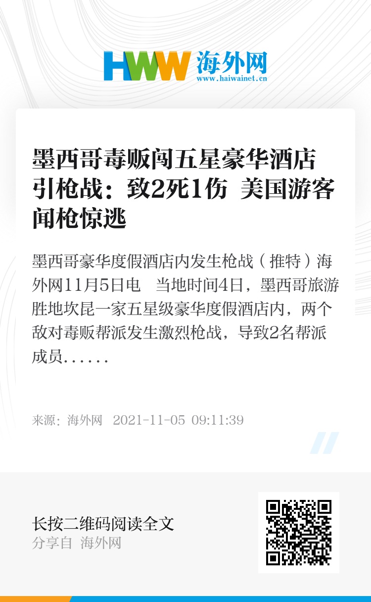 海外网11月5日电 当地时间4日,墨西哥旅游胜地坎昆一家五星级豪华度假酒店内,两个敌对毒贩帮派发生激烈枪战,导致2名帮派成员当场死亡,1名游客受伤。涉事酒店以接待美国游客为主,暴力事件引起店内房客的恐慌。