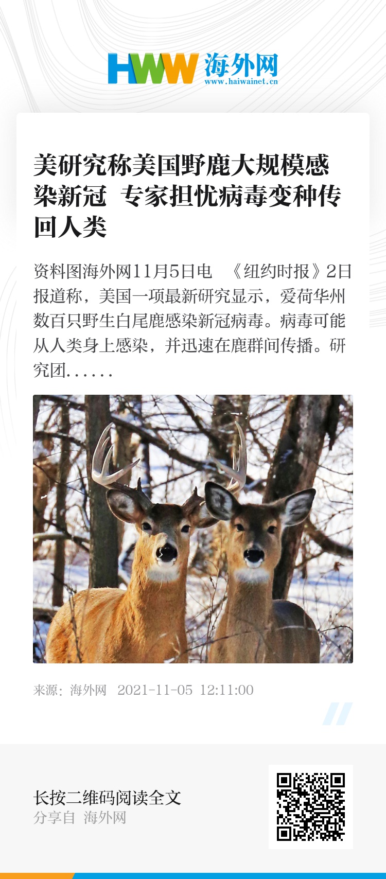 研究团队表示,这一研究结果令人不安,并提醒猎杀和处理死鹿的人员采取防护措施,避免病毒传播。研究人员担心,新冠病毒会持续在爱荷华州野生动物中扩散,野鹿很有可能成为动物宿主。如果病毒在鹿等新宿主之间传播发生变种,很可能会重新传给人类。(海外网 张琪)
