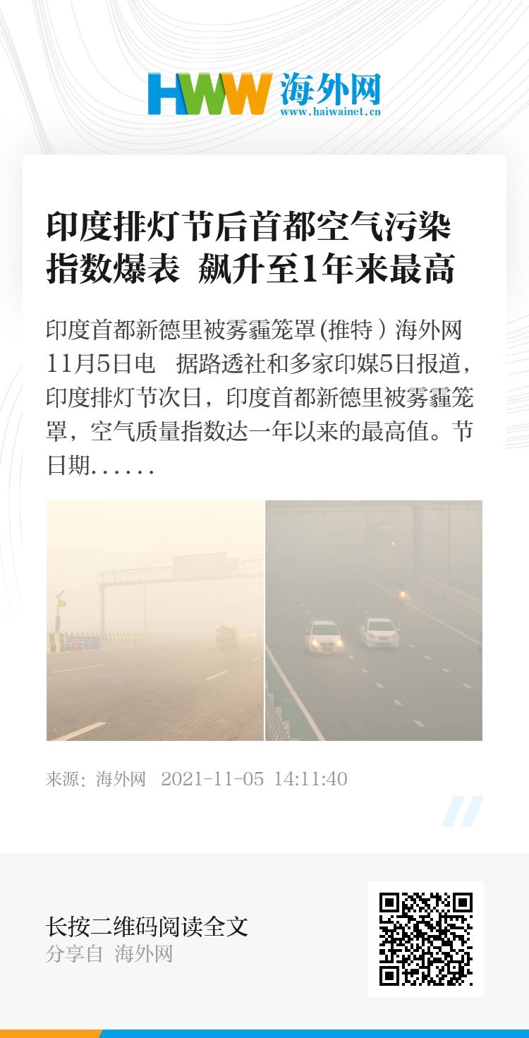 据报道,11月4日的排灯节是印度最为隆重的烟火盛会。新德里空气质量从节日当天上午开始迅速变差,机场道路能见度仅有600至800米。节后首日,新德里的空气质量指数(AQI)飙升至451。印度空气质量指数最高阈值为500,最新数字达到12个月以来的最高纪录,属于严重污染。“严重”是空气污染的最高等级,对人体健康产生影响,可能引发疾病或加重病情。