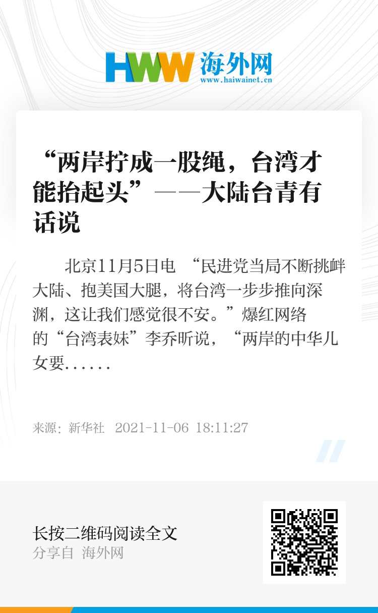 新华社北京11月5日电 “民进党当局不断挑衅大陆、抱美国大腿,将台湾一步步推向深渊,这让我们感觉很不安。”爆红网络的“台湾表妹”李乔昕说,“两岸的中华儿女要拧成一股绳,台湾才能有更好的发展,才能抬起头。”