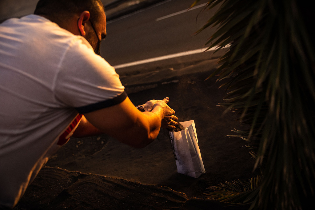 西班牙火山持续喷发 男子把火山灰装袋“收藏”