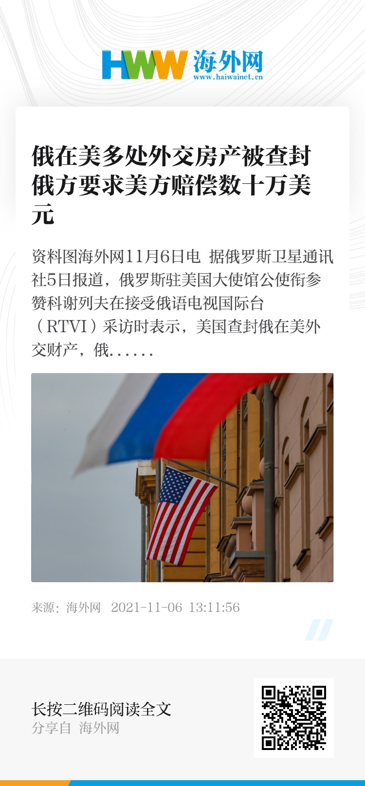 海外网11月6日电 据俄罗斯卫星通讯社5日报道,俄罗斯驻美国大使馆公使衔参赞科谢列夫在接受俄语电视国际台(RTVI)采访时表示,美国查封俄在美外交财产,俄方要求美方予以赔偿,金额达数十万美元。