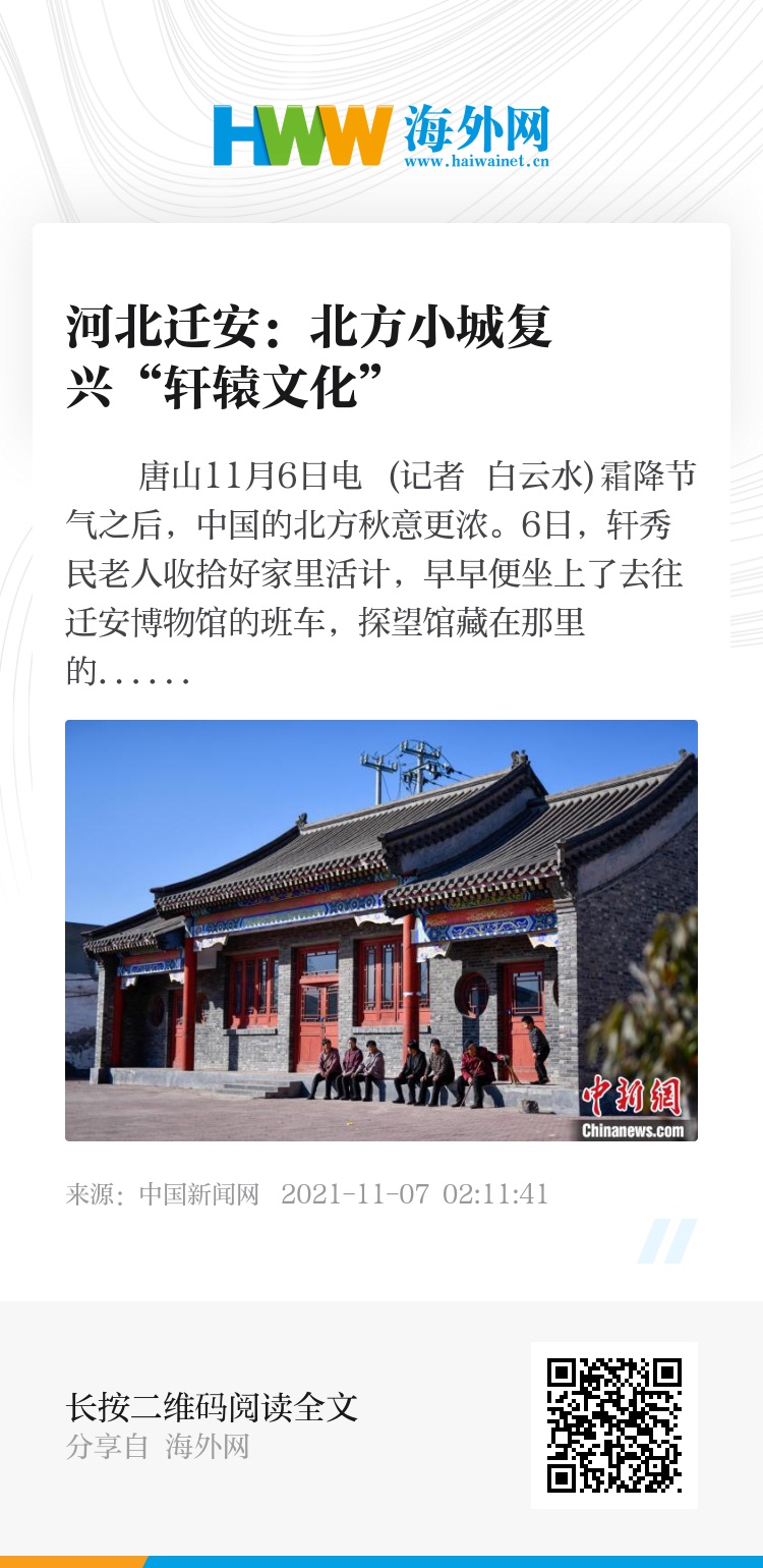 中新网唐山11月6日电 (记者 白云水)霜降节气之后,中国的北方秋意更浓。6日,轩秀民老人收拾好家里活计,早早便坐上了去往迁安博物馆的班车,探望馆藏在那里的一个“老物件”。