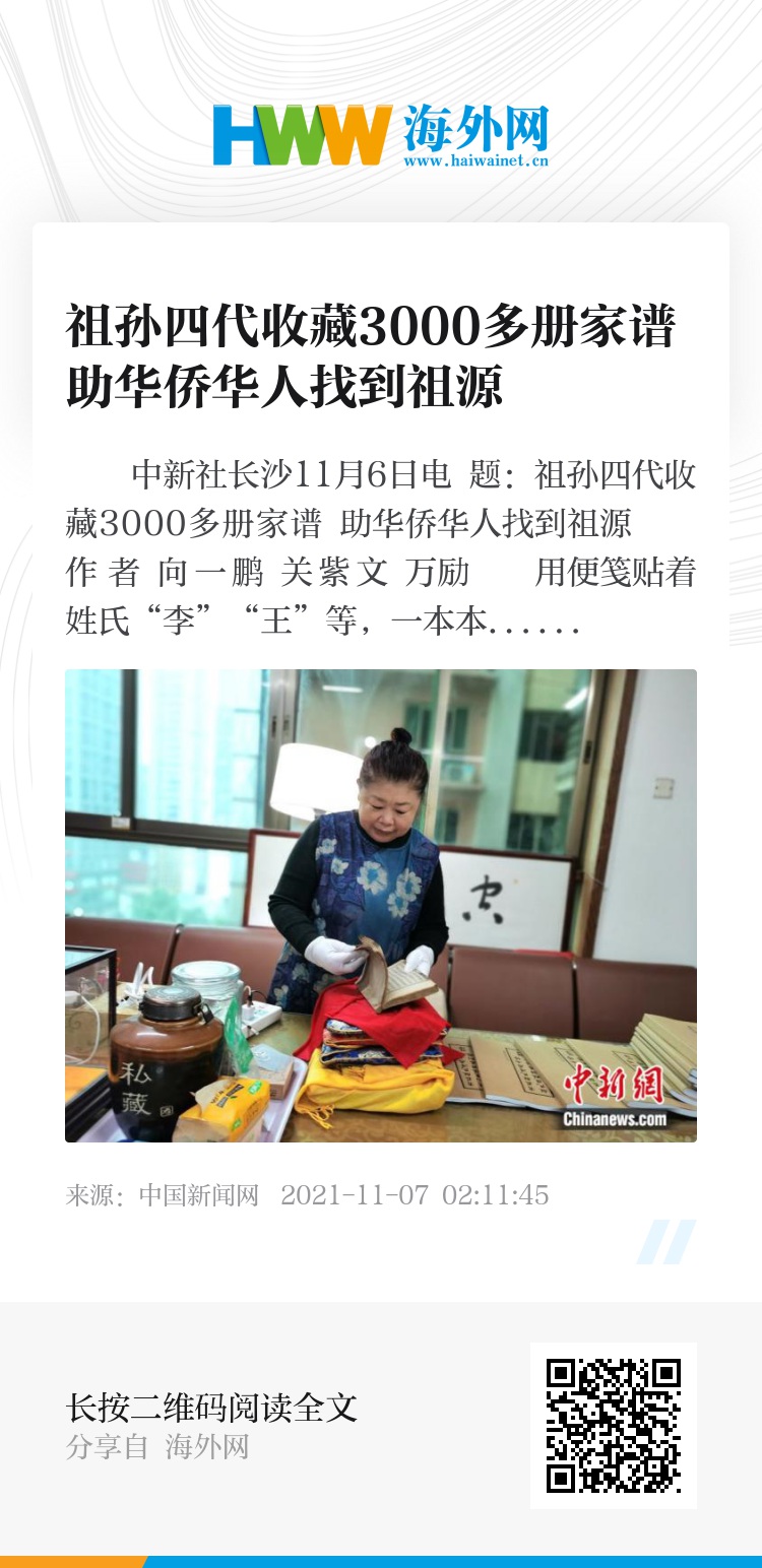 中新社长沙11月6日电 题:祖孙四代收藏3000多册家谱 助华侨华人找到祖源