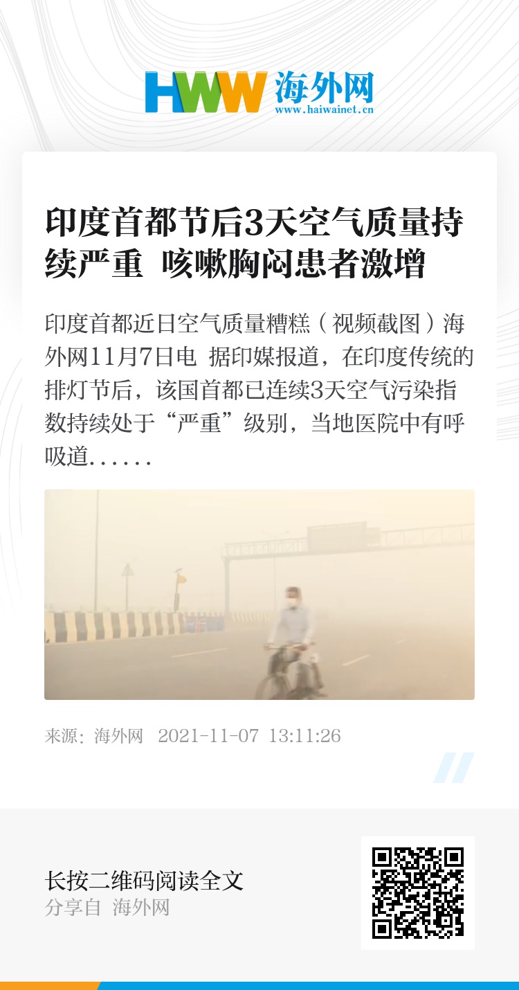 海外网11月7日电 据印媒报道,在印度传统的排灯节后,该国首都已连续3天空气污染指数持续处于“严重”级别,当地医院中有呼吸道问题的患者人数也在激增。