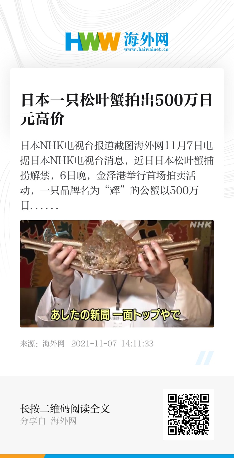海外网11月7日电 据日本NHK电视台消息,近日日本松叶蟹捕捞解禁,6日晚,金泽港举行首场拍卖活动,一只品牌名为“辉”的公蟹以500万日元(约合人民币28万元)的价格成交。