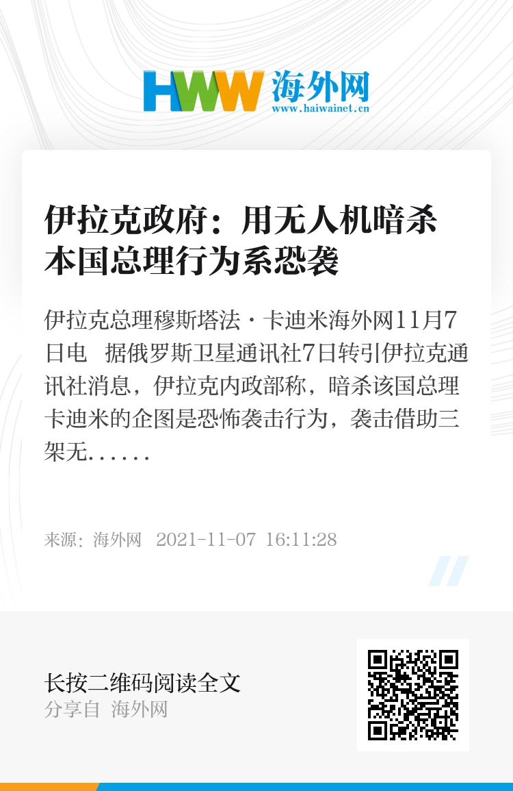 海外网11月7日电 据俄罗斯卫星通讯社7日转引伊拉克通讯社消息,伊拉克内政部称,暗杀该国总理卡迪米的企图是恐怖袭击行为,袭击借助三架无人机实施。