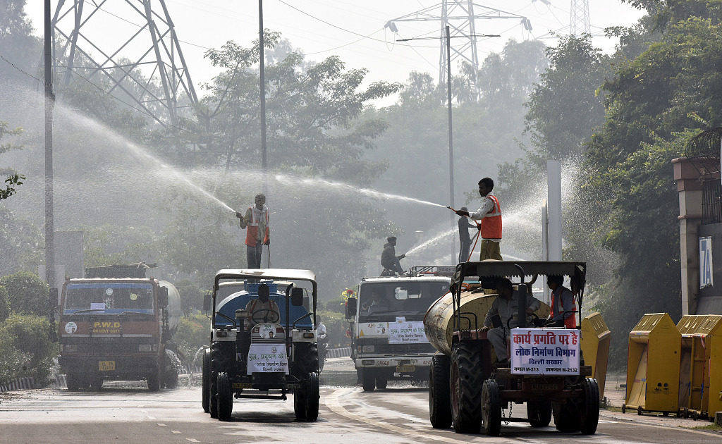 当地时间2021年11月6日,印度新德里,当地民众沿街洒水。据印媒报道,在印度传统的排灯节后,该国首都已连续3天空气污染指数处于“严重”级别,当地医院中有呼吸道问题的患者人数也在激增。图源:视觉中国