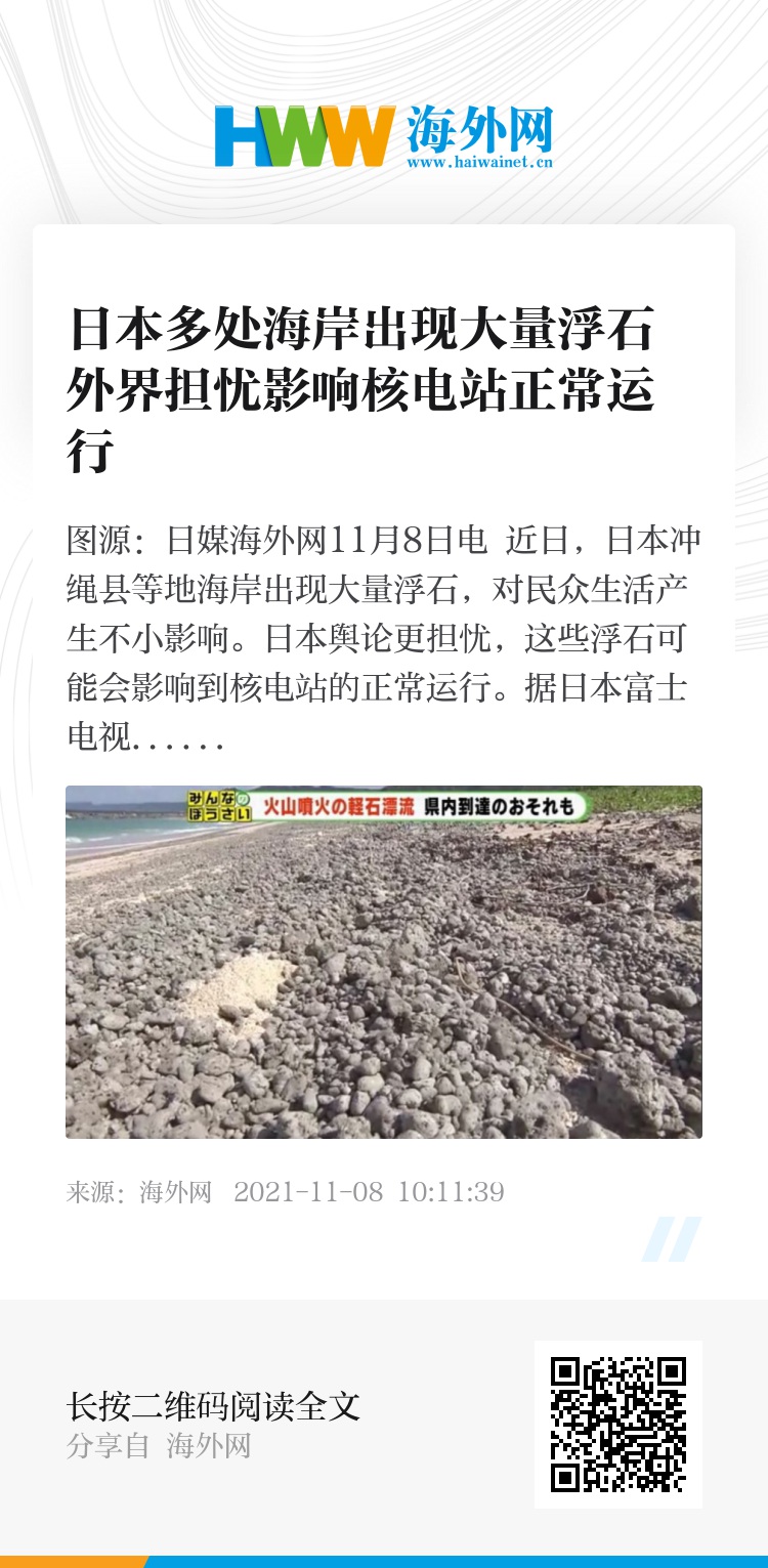海外网11月8日电 近日,日本冲绳县等地海岸出现大量浮石,对民众生活产生不小影响。日本舆论更担忧,这些浮石可能会影响到核电站的正常运行。
