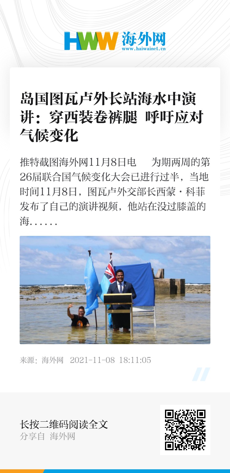 海外网11月8日电 为期两周的第26届联合国气候变化大会已进行过半,当地时间11月8日,图瓦卢外交部长西蒙·科菲发布了自己的演讲视频,他站在没过膝盖的海水中讲话,直观展示了气候变化给这个地势极低的太平洋岛国带来的影响。
