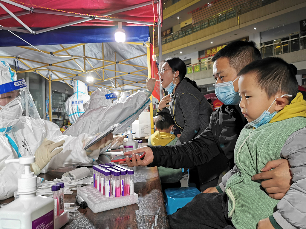 2021年11月8日晚,成都市锦江区蓝谷地社区,医务人员通宵达旦值守在“新冠病毒核酸采样点”为市民免费进行核酸检测。图源:人民视觉