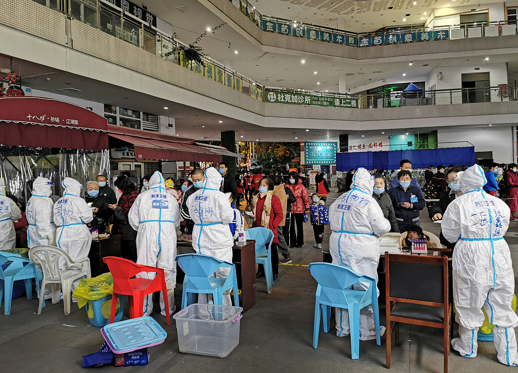 2021年11月8日晚,成都市锦江区蓝谷地社区,医务人员通宵达旦值守在“新冠病毒核酸采样点”为市民免费进行核酸检测。图源:人民视觉