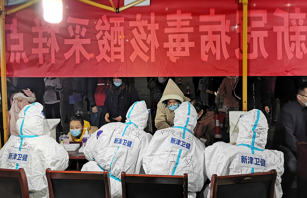 2021年11月8日晚,成都市锦江区蓝谷地社区,医务人员通宵达旦值守在“新冠病毒核酸采样点”为市民免费进行核酸检测。图源:人民视觉
