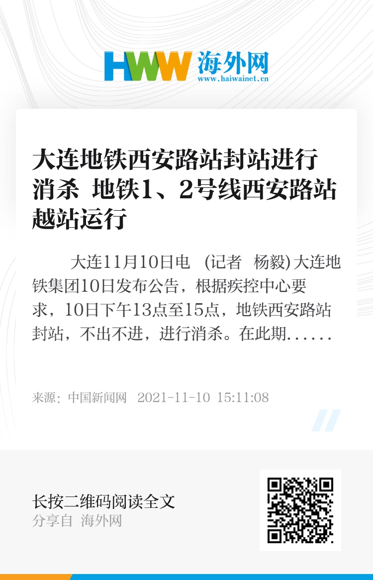 中新网大连11月10日电 (记者 杨毅)大连地铁集团10日发布公告,根据疾控中心要求,10日下午13点至15点,地铁西安路站封站,不出不进,进行消杀。在此期间,地铁1、2号线西安路站越站运行。
