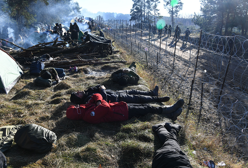 当地时间11月9日,白俄罗斯,数千名聚集在白俄罗斯的难民抵达白方和波兰接壤的边境地区,当中的一些人试图通过库兹尼察过境点强行入境波兰。图片来源:人民视觉