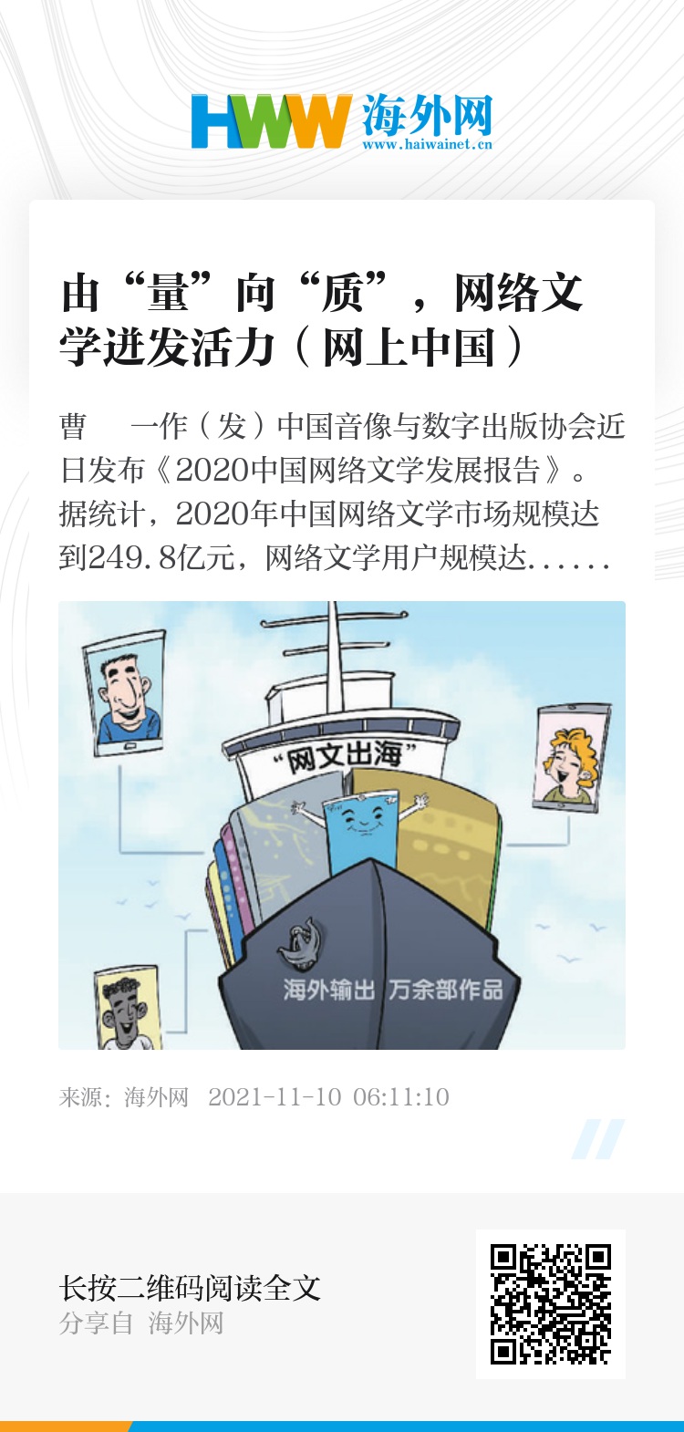 网络文学也成为中国文化产品出海最大的IP来源。《2021年中国网络文学出海研究报告》数据显示,2020年,中国网络文学在海外市场的规模已达11.3亿元,海外用户达到8316.1万人,预计今年仍将翻倍增长,突破30亿元人民币大关,用户规模也将达到近1.5亿人。