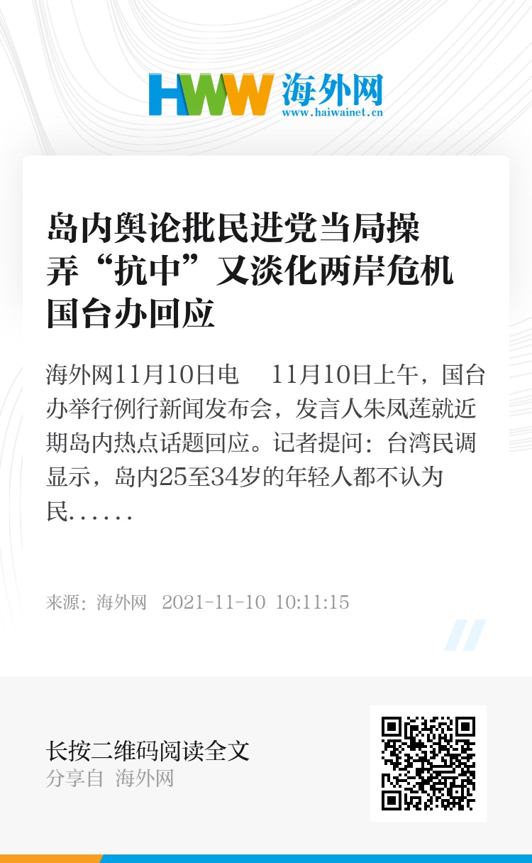 海外网11月10日电 11月10日上午,国台办举行例行新闻发布会,发言人朱凤莲就近期岛内热点话题回应。