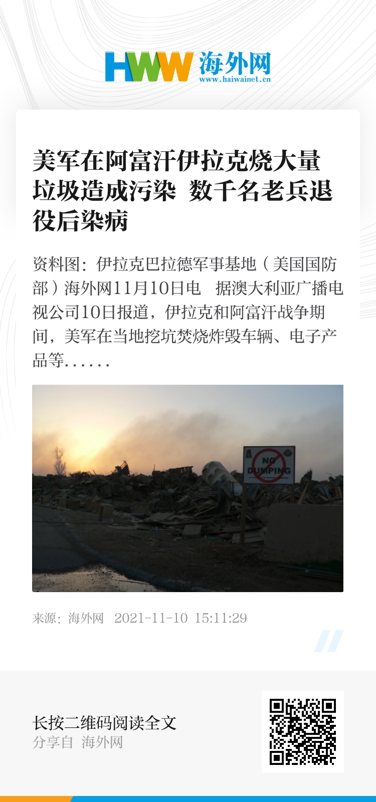 海外网11月10日电 据澳大利亚广播电视公司10日报道,伊拉克和阿富汗战争期间,美军在当地挖坑焚烧炸毁车辆、电子产品等各种垃圾,造成严重环境污染,数千名驻伊拉克和阿富汗老兵退役后患上呼吸系统疾病甚至癌症,老兵们纷纷怀疑染病与驻军期间的环境污染有关。