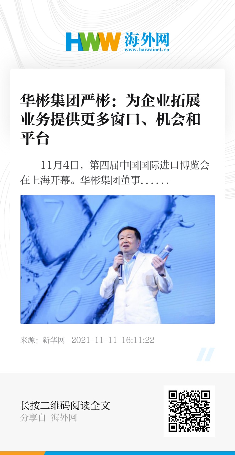 11月4日,第四届中国国际进口博览会在上海开幕。华彬集团董事长严彬作为嘉宾参加了开幕式。