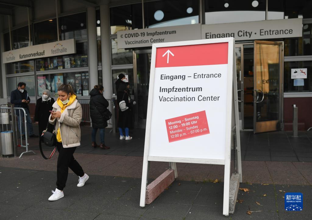 这是11月10日在德国法兰克福拍摄的一处新冠疫苗接种中心外的指示牌。德国疾控机构罗伯特·科赫研究所10日报告,德国单日新增新冠确诊病例39676例,创下德国暴发疫情以来的最高纪录。新华社记者 逯阳 摄