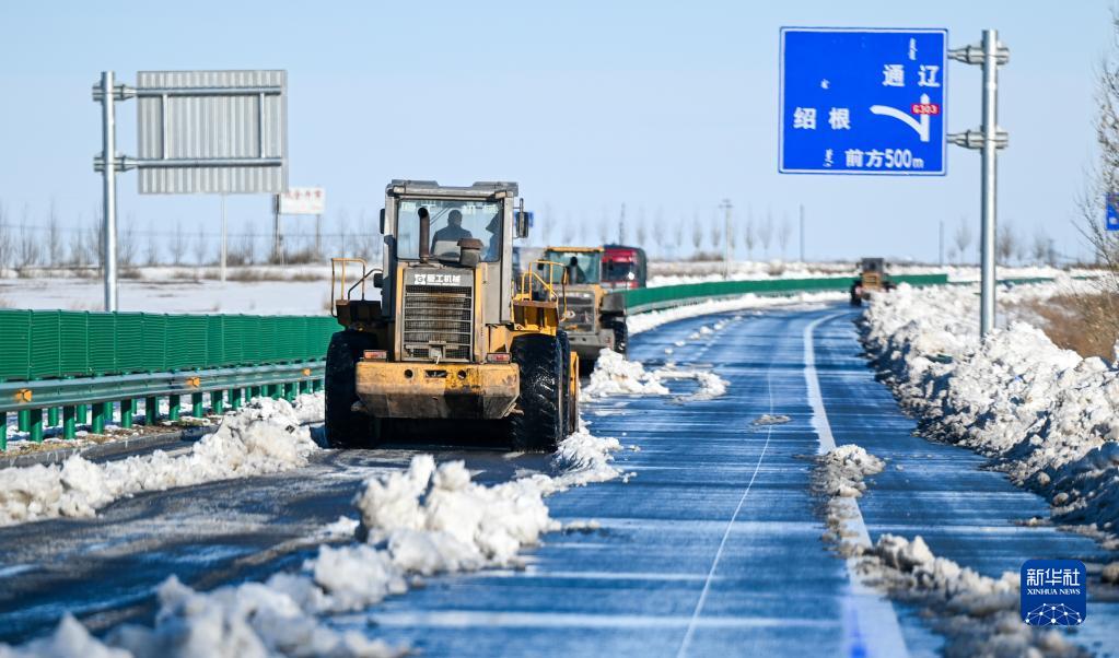 11月10日,在内蒙古赤峰市303国道上,作业车辆清理积雪。近日,内蒙古通辽市、赤峰市等地连续出现暴雪、大暴雪天气。通辽市遭遇当地有气象记录以来的最强暴风雪天气。大雪对当地交通、农牧业生产造成影响,当地正积极组织力量投入除雪等工作。新华社记者 连振 摄