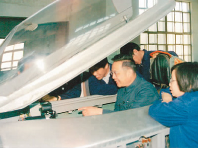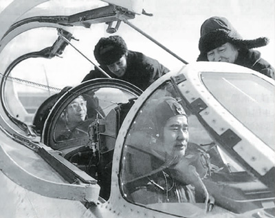顾诵芬(后座)与飞行员鹿鸣东在歼教6 飞机上。