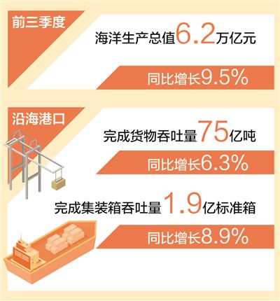 人民日报北京11月10日电 (记者刘诗瑶)日前,自然资源部发布数据显示:我国海洋经济复苏进程稳健,市场需求逐步回升。初步核算,前三季度海洋生产总值6.2万亿元,同比增长9.5%。