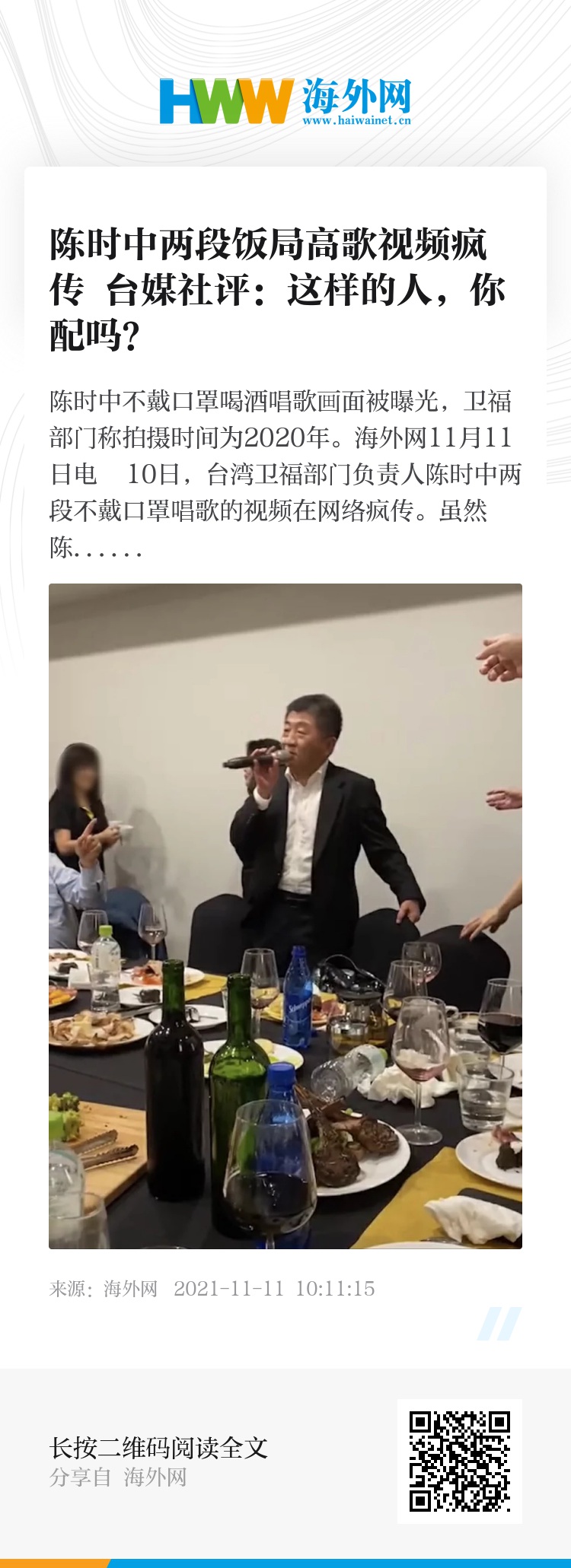 10日,陈时中一段疫情期间不戴口罩喝酒唱歌的46秒视频疯传。虽然卫福部门澄清视频拍摄时间点为2020年解封后,但仍引发岛内舆论不满。国民党市议员拟参选人田方伦甚至曝光另一段视频,指陈时中11月9日也曾在台上高歌,质问台湾防疫标准到底为何?(海外网 李萌)
