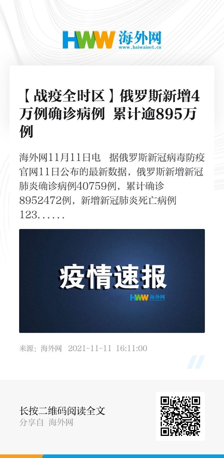 海外网11月11日电 据俄罗斯新冠病毒防疫官网11日公布的最新数据,俄罗斯新增新冠肺炎确诊病例40759例,累计确诊8952472例,新增新冠肺炎死亡病例1237例,累计死亡251691例。(海外网 李芳)