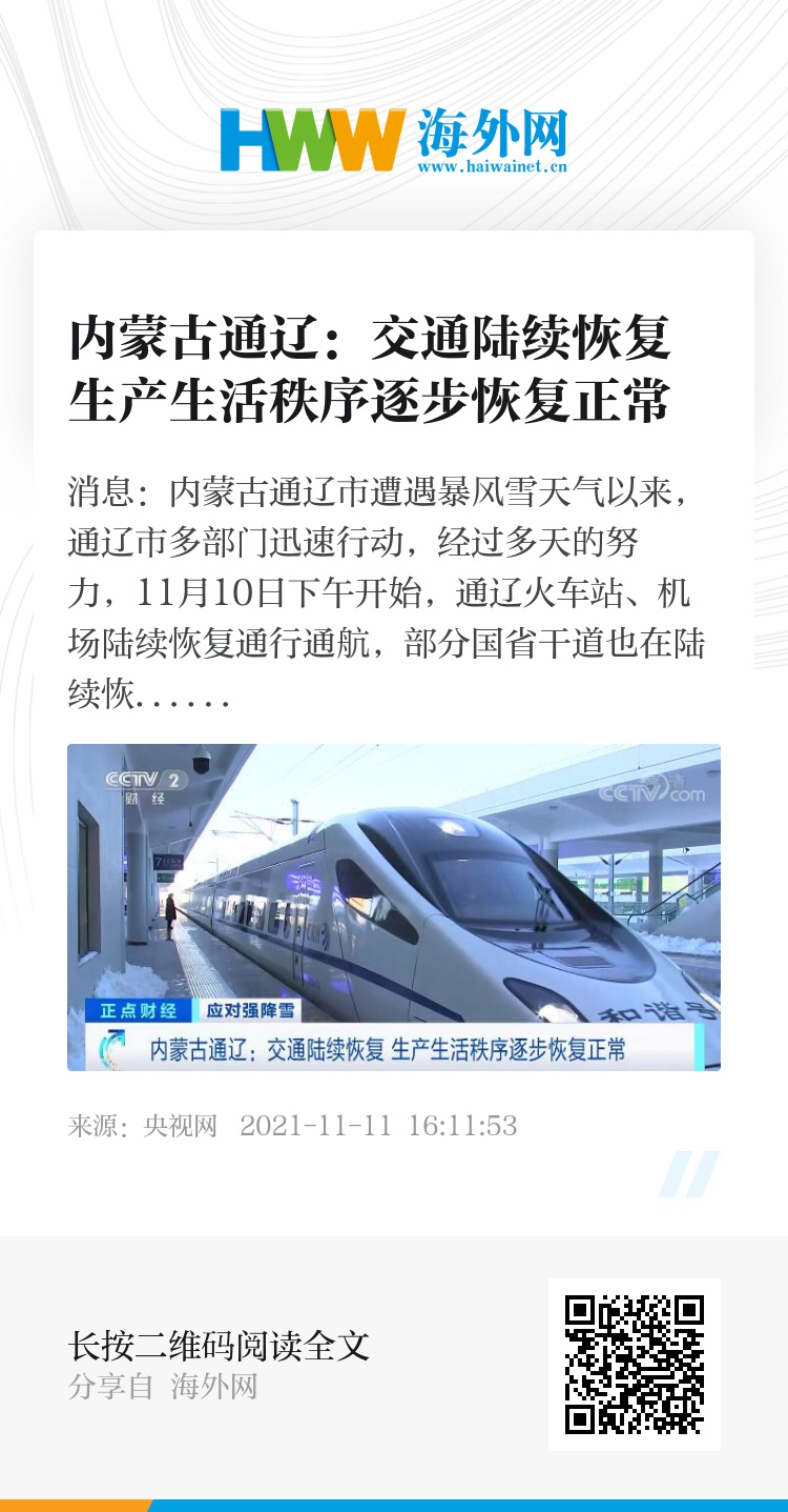央视网消息:内蒙古通辽市遭遇暴风雪天气以来,通辽市多部门迅速行动,经过多天的努力,11月10日下午开始,通辽火车站、机场陆续恢复通行通航,部分国省干道也在陆续恢复通行。