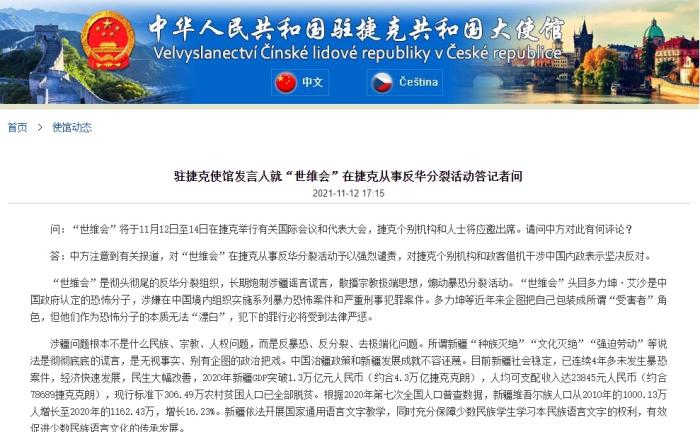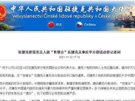 中国驻捷克大使馆发言人回应称,中方注意到有关报道,对“世维会”在捷克从事反华分裂活动予以强烈谴责,对捷克个别机构和政客借机干涉中国内政表示坚决反对。