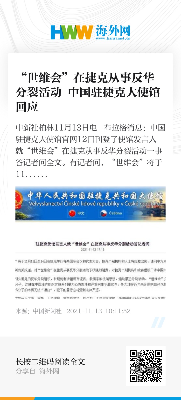 中新社柏林11月13日电 布拉格消息:中国驻捷克大使馆官网12日刊登了使馆发言人就“世维会”在捷克从事反华分裂活动一事答记者问全文。