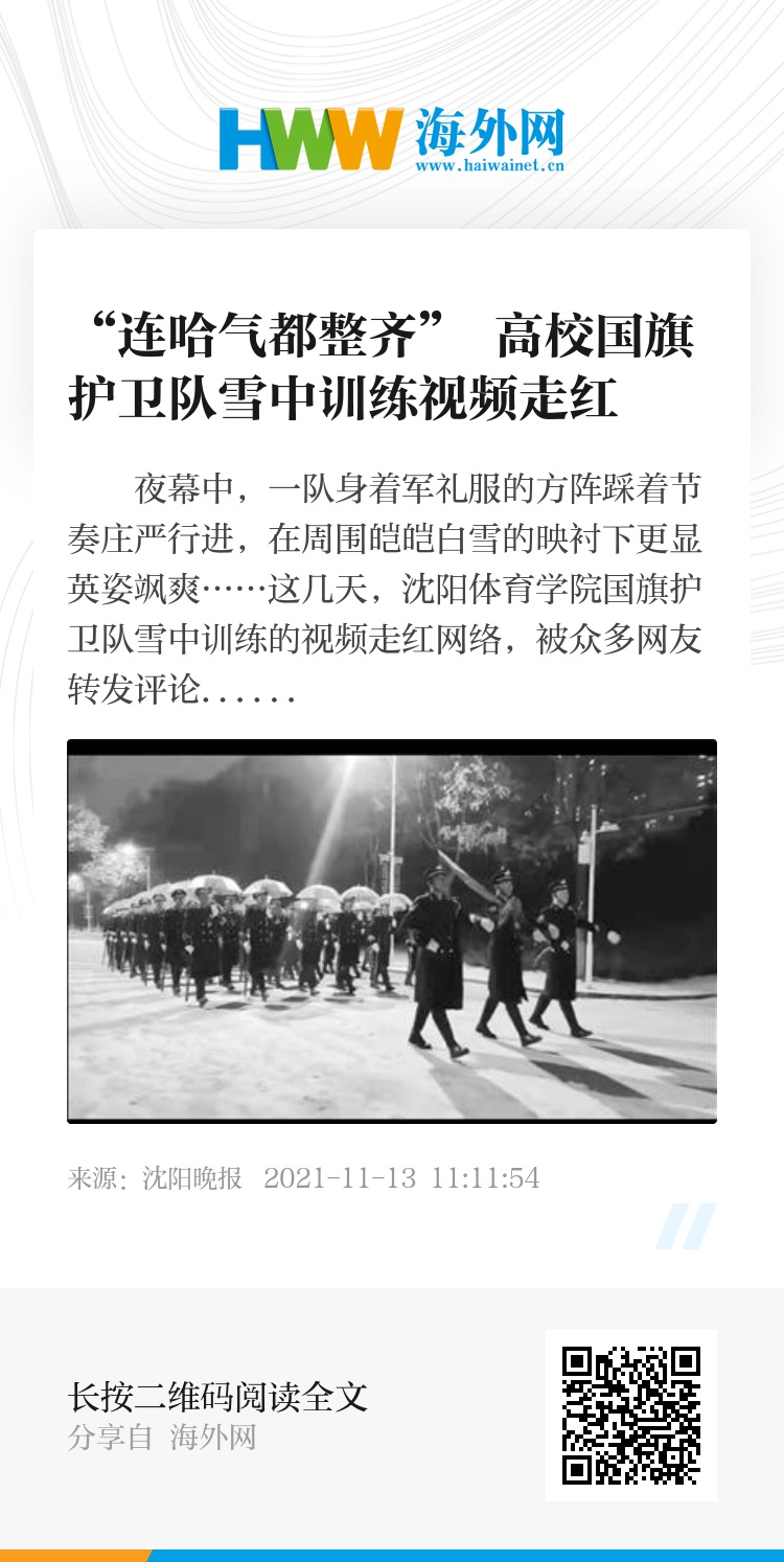 夜幕中,一队身着军礼服的方阵踩着节奏庄严行进,在周围皑皑白雪的映衬下更显英姿飒爽……这几天,沈阳体育学院国旗护卫队雪中训练的视频走红网络,被众多网友转发评论,并获得数万点赞。“这是我见过走得最齐的学生正步!”“好帅啊,教官肯定也不简单!”“连哈气都很整齐,呼吸都同步!”网友们纷纷留言感叹。