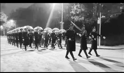视频中,被白雪覆盖的校园里,伴随着嘹亮的军歌和口号,踏雪而来的国旗护卫队队员们一手撑伞,一手握枪,皮靴踩在雪地上嘎吱作响整齐划一,不时引得同学们驻足观看、拍摄。