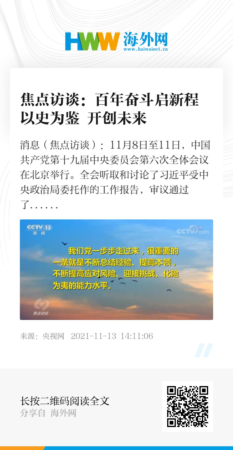 央视网消息(焦点访谈):11月8日至11日,中国共产党第十九届中央委员会第六次全体会议在北京举行。全会听取和讨论了习近平受中央政治局委托作的工作报告,审议通过了《中共中央关于党的百年奋斗重大成就和历史经验的决议》,这也是百年历程中我们党通过的第三个历史决议。建党百年之际,在“两个一百年”奋斗目标历史性交汇的重要时间节点,中国共产党如何总结过去、开辟未来?我们应该如何理解这份《决议》的分量和它的重大意义呢?