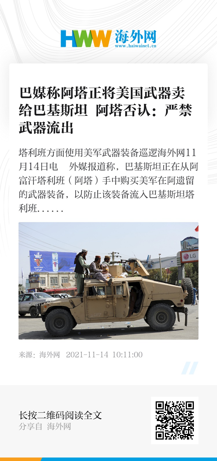 海外网11月14日电 外媒报道称,巴基斯坦正在从阿富汗塔利班(阿塔)手中购买美军在阿遗留的武器装备,以防止该装备流入巴基斯坦塔利班(巴塔)手中。阿塔方面当地时间周五(12日)对相关报道予以否认。