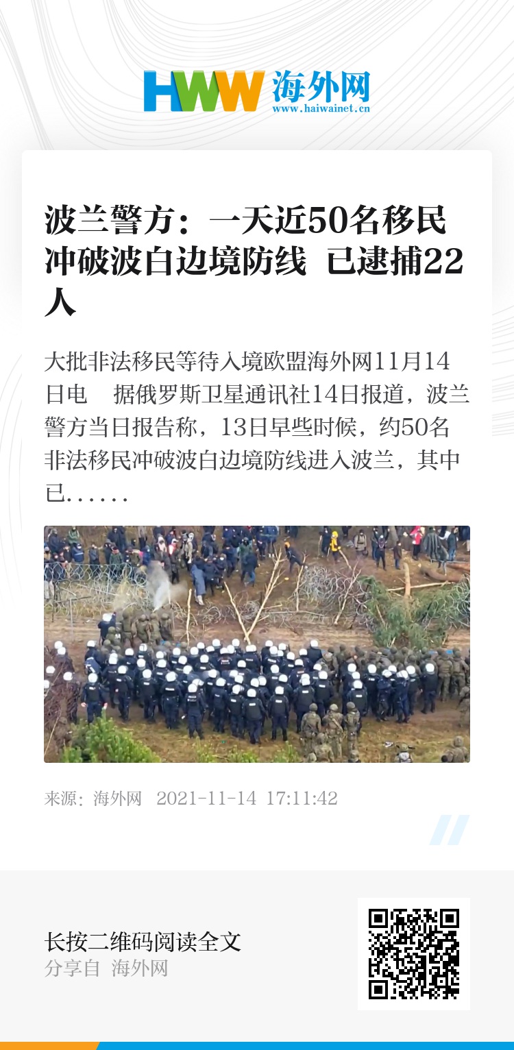海外网11月14日电 据俄罗斯卫星通讯社14日报道,波兰警方当日报告称,13日早些时候,约50名非法移民冲破波白边境防线进入波兰,其中已有22人被捕。