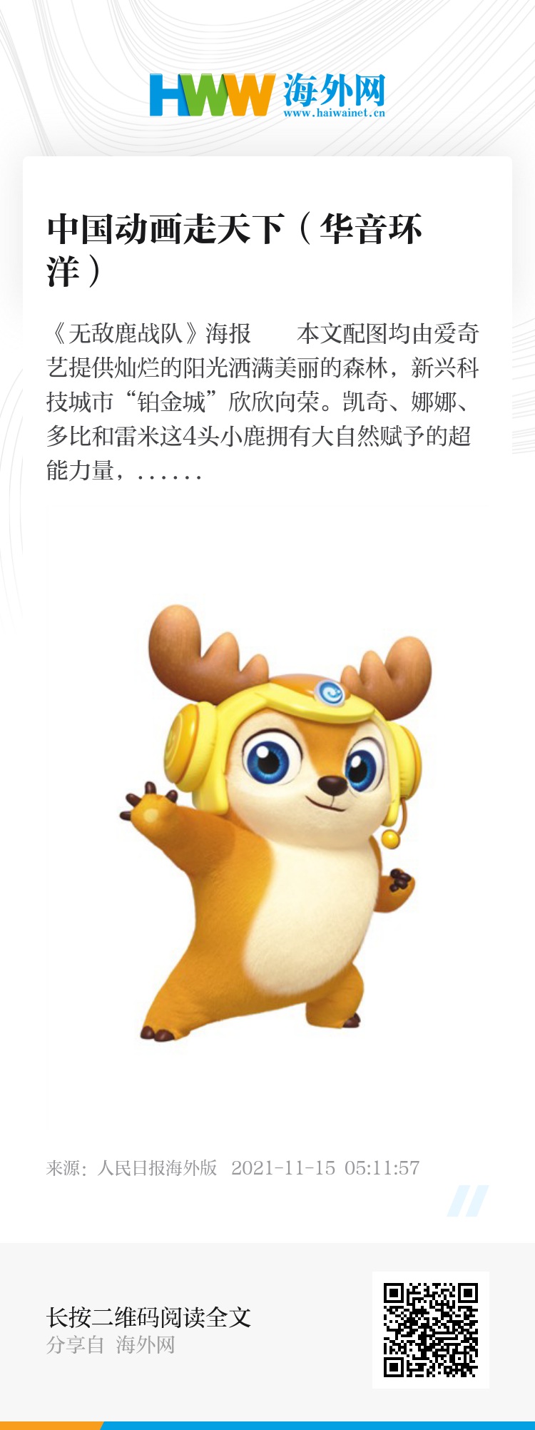 “《无敌鹿战队》开启了中国动画‘走出去’的新篇章。”中国传媒大学动画学院院长黄心渊说,“互联网平台是无国界的,这为国产动画出海提供了更便利的渠道。”