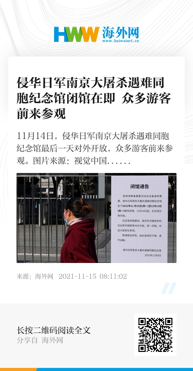 32273873,.侵华日军南京大屠杀遇难同胞纪念馆闭馆在即 众多游客前来参观,.2021-11-15 08:58:02,.204428,.张青津、夏丽娟