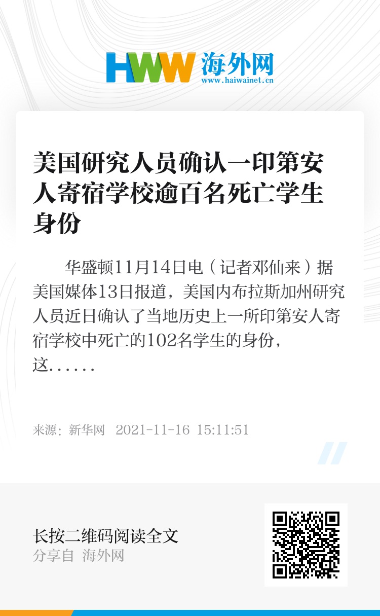 新华社华盛顿11月14日电(记者邓仙来)据美国媒体13日报道,美国内布拉斯加州研究人员近日确认了当地历史上一所印第安人寄宿学校中死亡的102名学生的身份,这些学生大多是年幼的孩子。